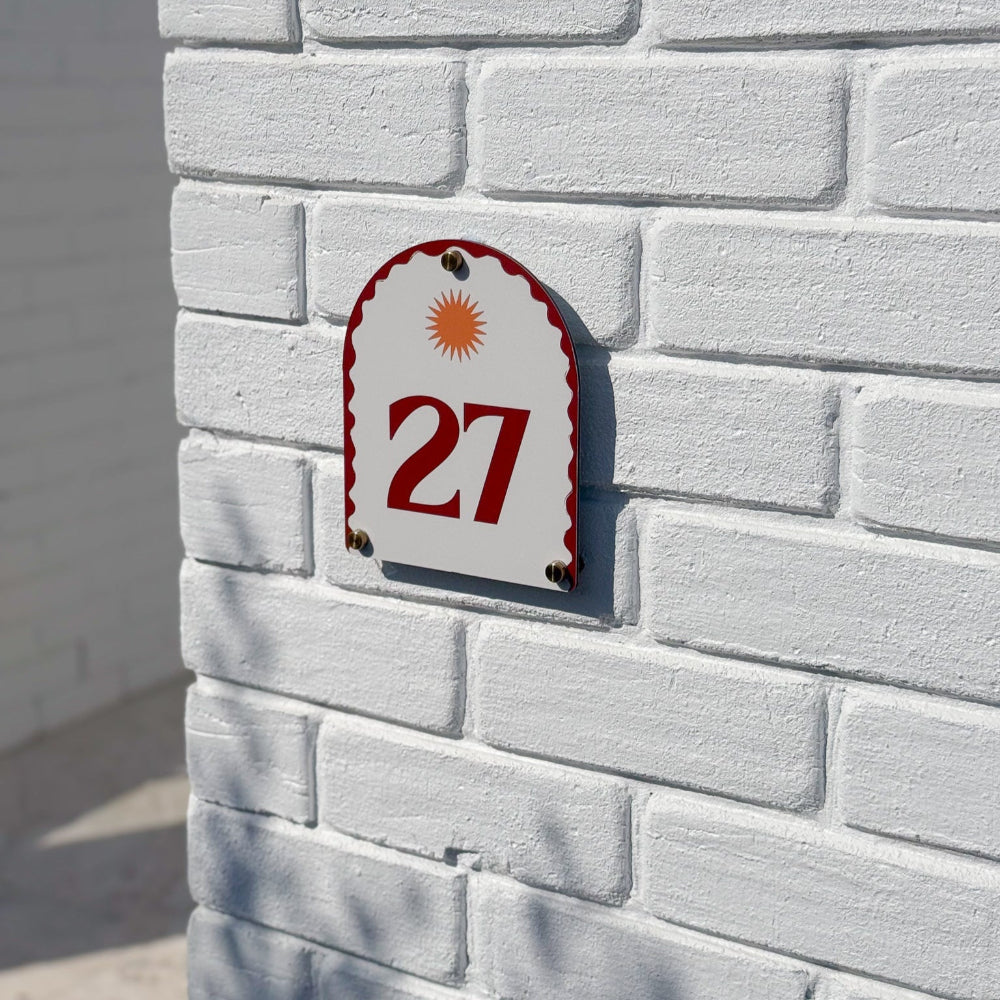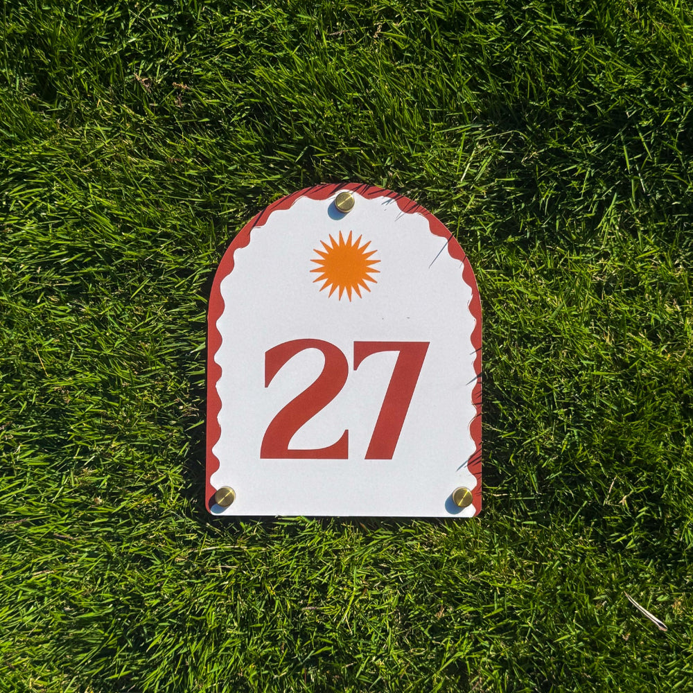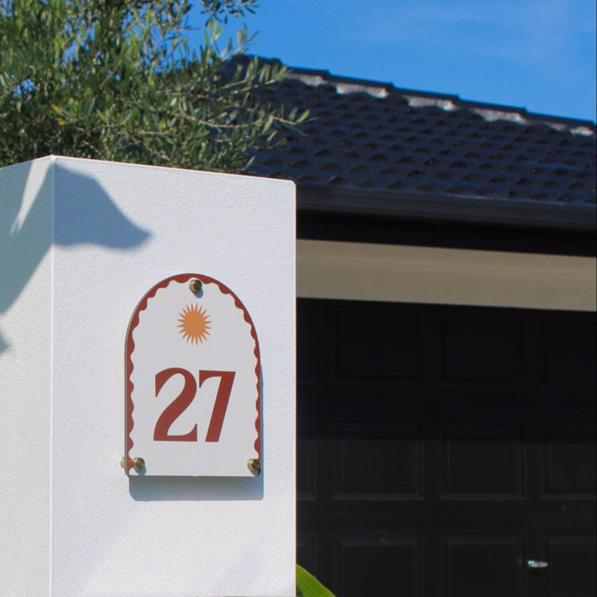 Each sign features our signature arched shape, playful wavy border, and a radiant sun motif — personalised with your house number and designed to blend function with feeling. It’s about bringing that relaxed, just-back-from-somewhere-beautiful feeling home with you.