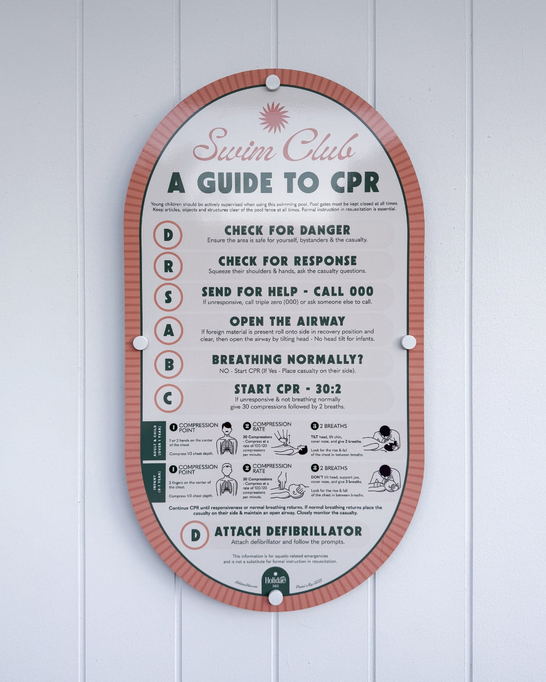 Large font sizes and contrast colours to meet the 3m readability compliance requirement. CPR signs should be highly readable from a distance so you (or your kids) can follow the instructions an emergency.