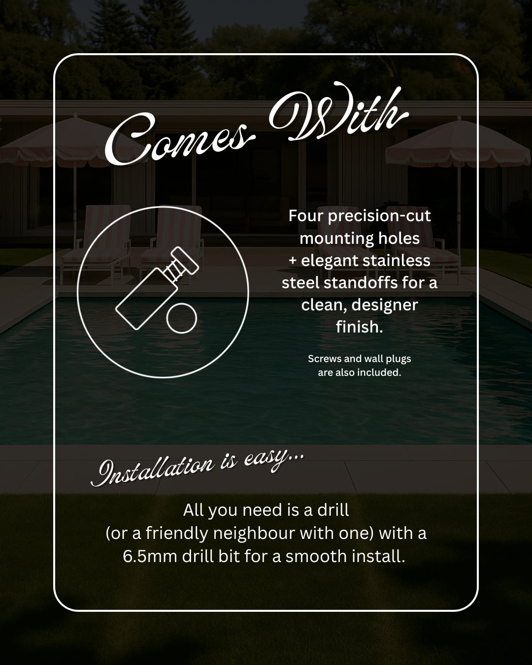 Stand-off screws give your sign a premium, architectural finish by lifting it 20mm off the wall, creating depth and style. They also protect against trapped moisture behind your sign, allow easy removal, and keep your sign securely in place for the long run. Glass pool fence? No problems, there's suction cups available.